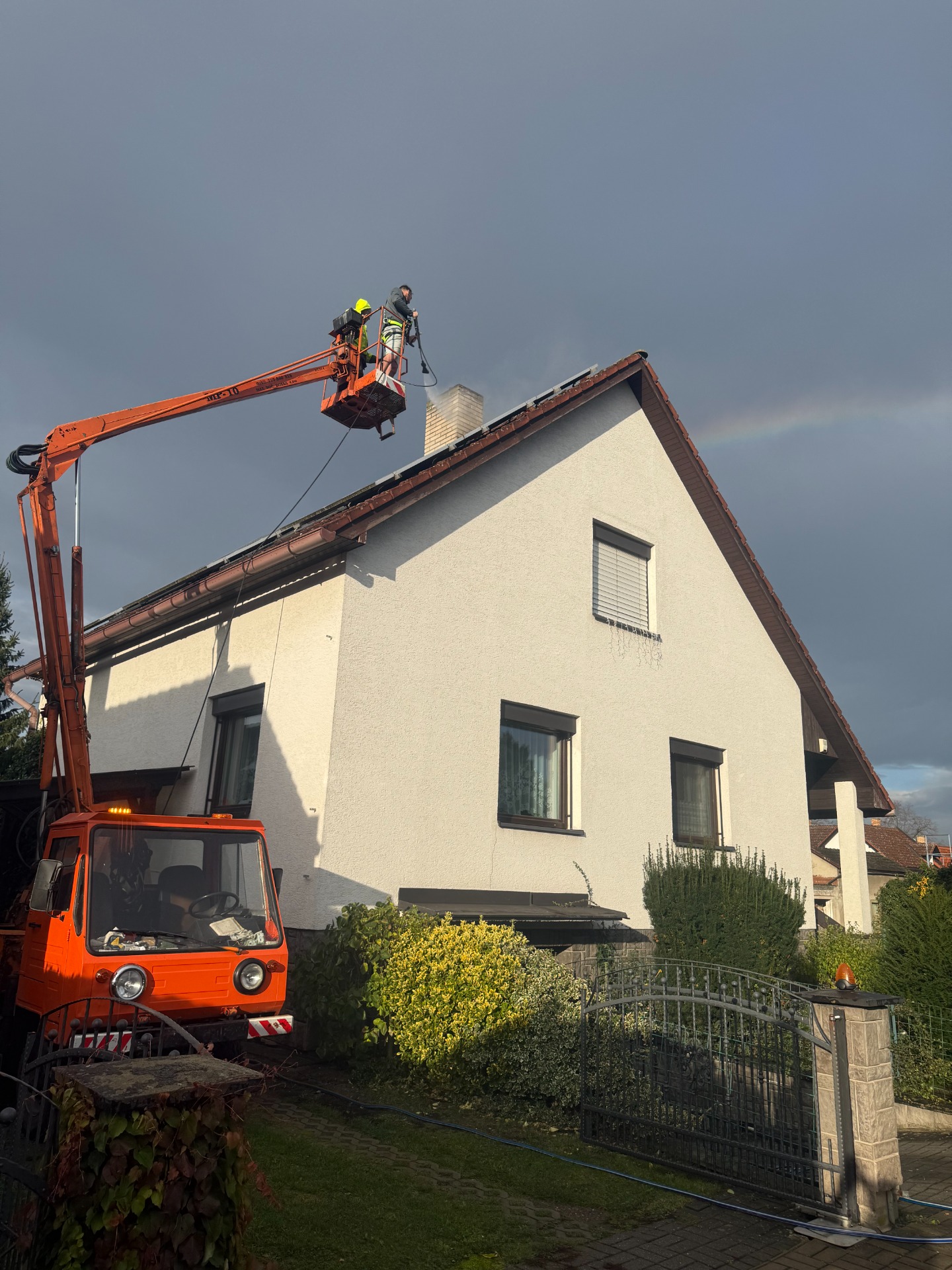 Rychlé a kvalitní vyčištění za jeden den, Fasády i střechy čistíme bez nutnosti lešení s vysokozdvižnou plošinou.