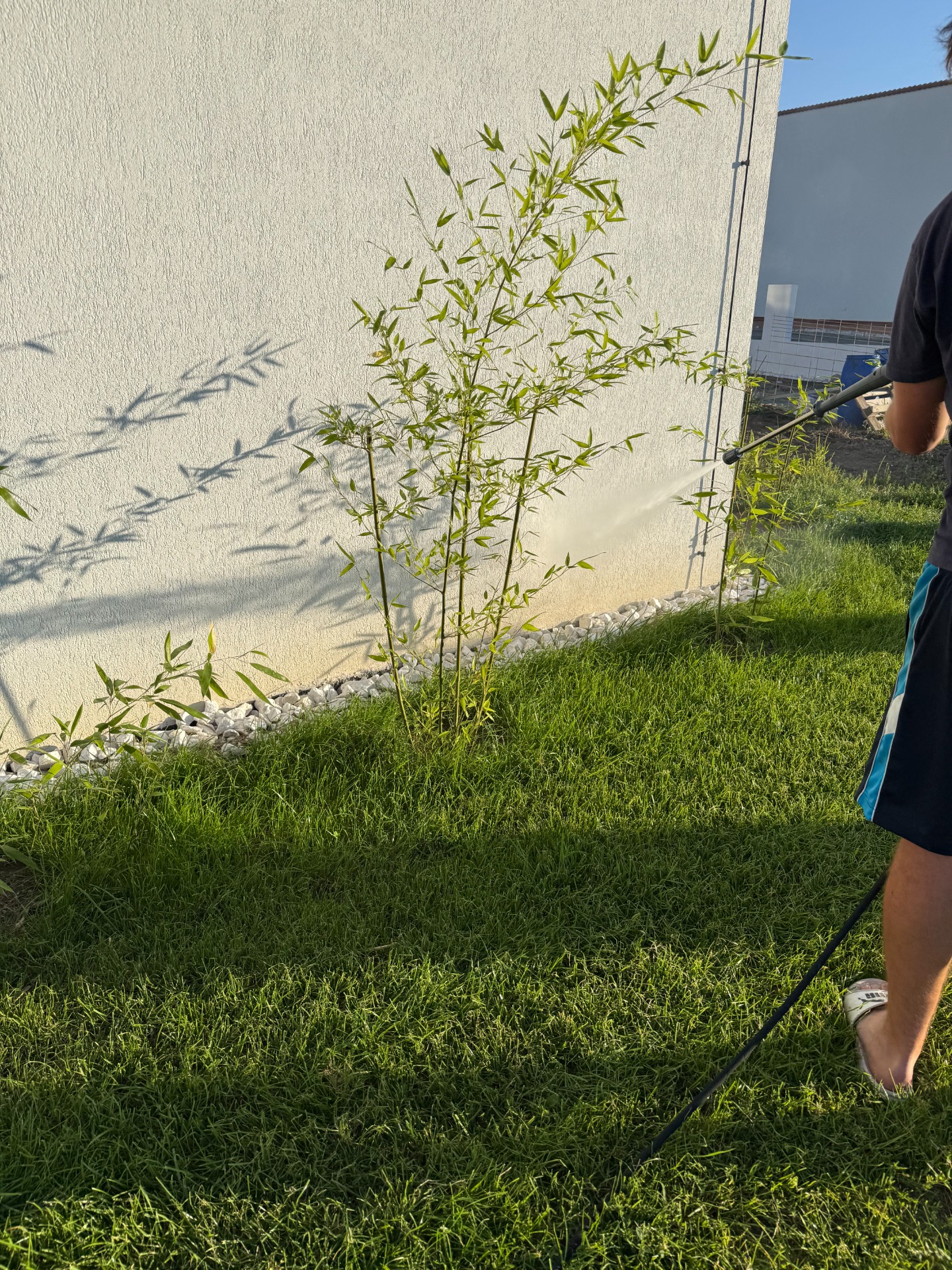 Mytí novostavby po instalaci kačírkového pásu okolo domu